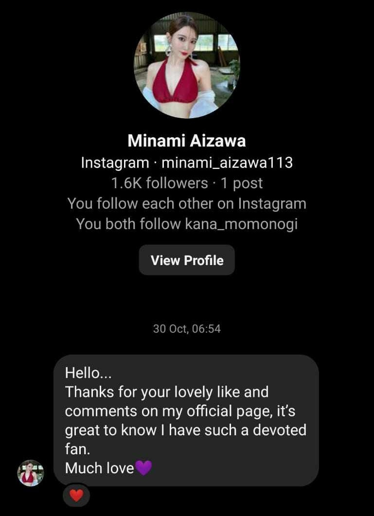 这是某位读者来信投书,我们先来讲一下他的基本资料,他是相沢みなみ(相泽南)的忠实粉丝,不过因为工作很忙,所以他从来没有参加过活动,每天就是在网路上看她的社群发文按赞;有一天,他突然发现自己在IG上被「minami_aizawa113」追踪,对方还敲他说感谢长久以来的支持: