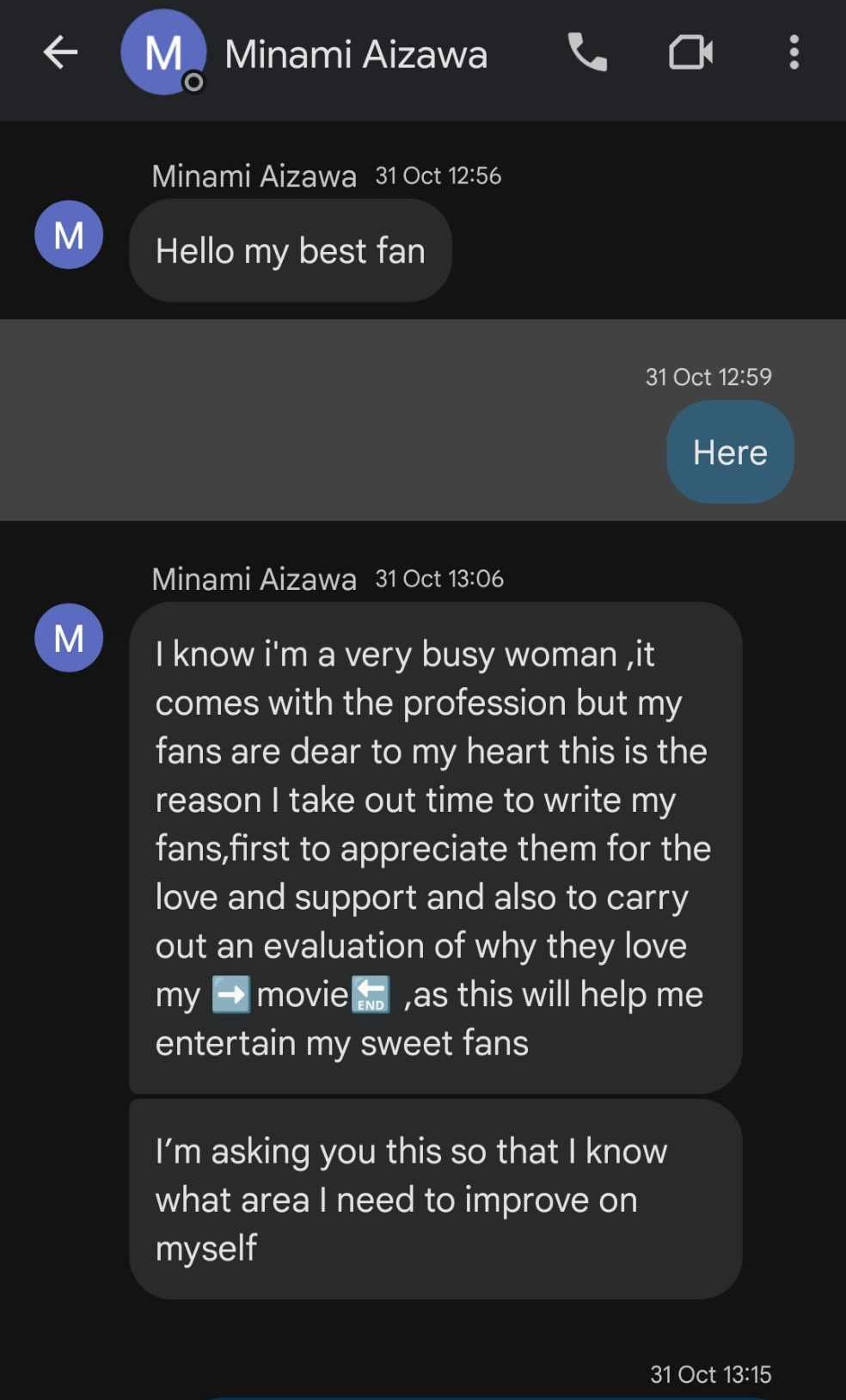 所以那位影迷说自己很感谢这个假帐号让自己有了和相沢みなみ(相泽南)本人聊天甚至是谈恋爱的错觉,不过进展到对方要一大笔钱去赔违约这阶段也就够了,所以除了在这儿公布仿冒者的IG以及Google Chat的帐号外,我也会向相沢みなみ(相泽南)提到有这个状况,希望别再有人冒用女优的名义骗钱~