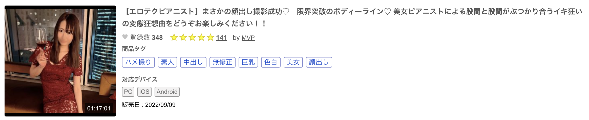 那就是FC2-PPV-2909046的作品「【エロテクピアニスト】まさかの颜出し撮影成功♡ 限界突破のボディーライン♡ 美女ピアニストによる股间と股间がぶつかり合うイキ狂いの変态狂想曲をどうぞお楽しみください!! 」,封面上的女优留着长发穿着华丽的洋装,据说是个钢琴家,她不只有着限界突破的身体曲线(ボディーライン,Body line)而且毫不忌讳地现身露面不戴口罩,更重要的是,她很变态〜