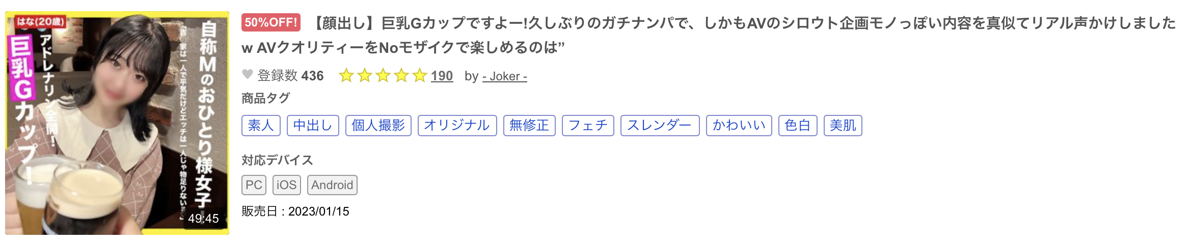然后一样是G罩杯也一样是卖家「- Joker -」的作品,我们可以确定她和演出FC2-PPV-3164706的女优是同一位ー虽然经纪人说有奶子就不怕没工作,不过既然这妹子很上道不戴口罩直接露脸,那我们当然要好好把她看个详细⋯