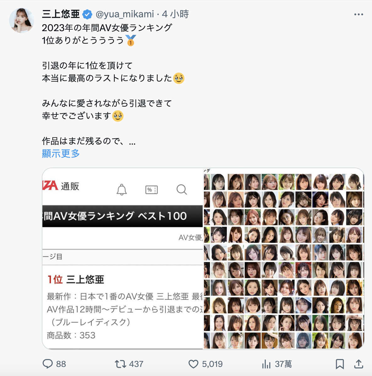 三上悠亜自己也很得意,昨天还发文感谢大家的支持,说能在引退的2023年拿下销售冠军是「最好的句点」;第二名则是河北彩花,昨天已经提到了,虽然前20名只有3支作品,但2023年的销售百大她仍然有超过10支作品进榜,如果不是因为三上要引退而且还像企划女优一样每周发片我认为河北彩花仍然会是销售冠军;第三名则是我讲很久的「美少女的天花板+销售的看板」石川澪,记得之前在介绍她是「天下第二人」时候还有蛮多人觉得我太浮夸了,但这次的榜单就说明了2023年的她有多么厉害〜